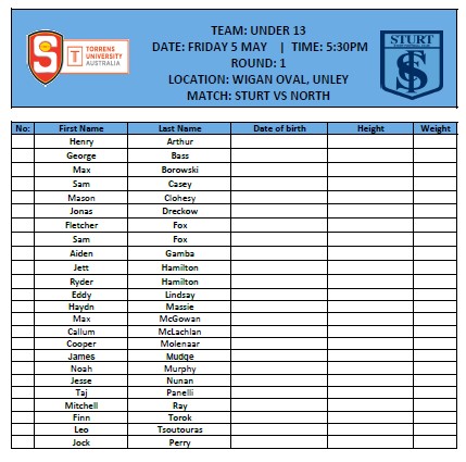 Team Sheet – Round 1 U13 v1