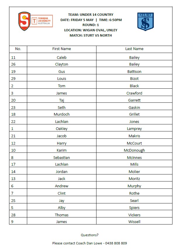 Under 14 – Round 1 – Team Sheet v1