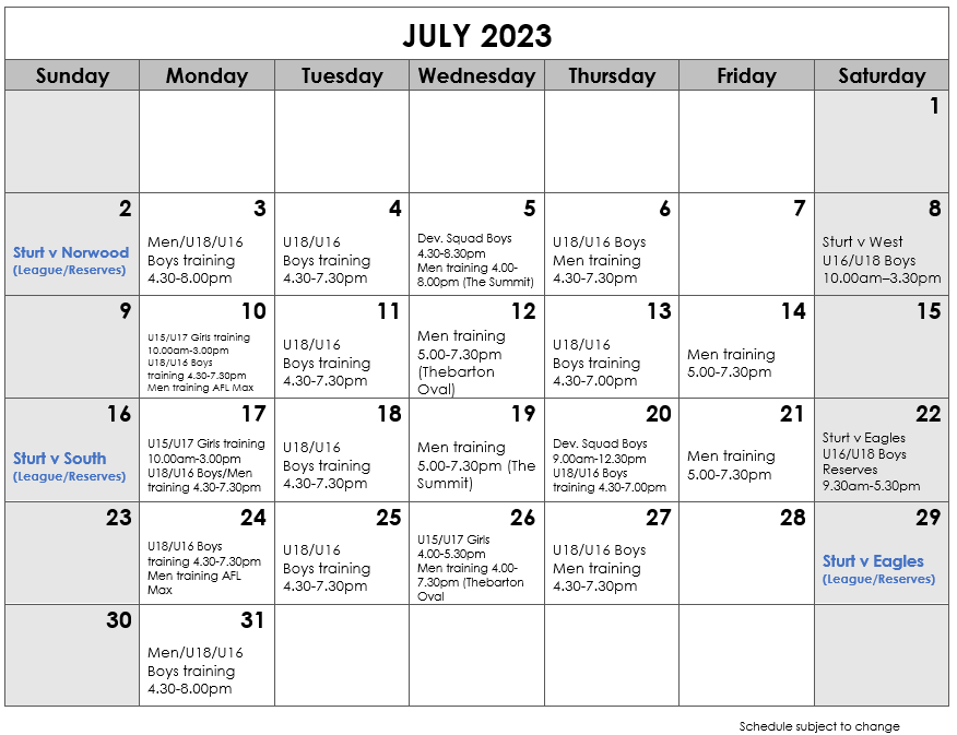Unley Oval Training Schedule
